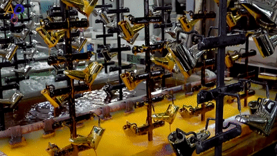 要想使水龙头成为整条街最倩的仔,表面处理是不可少的。常见的处理方式便是镀铬,这是我们最常见的银色。首先把把抛光好的水龙头壳体一个个挂在机器上,然后放入水中,通过超音波脱脂,把水龙头表面的杂质灰尘去掉。然后开始镀镍,再镀铬。烘干之后的水龙头将会用报纸包起来,防止其表面磕碰,然后被送到下一工序,进行打标。